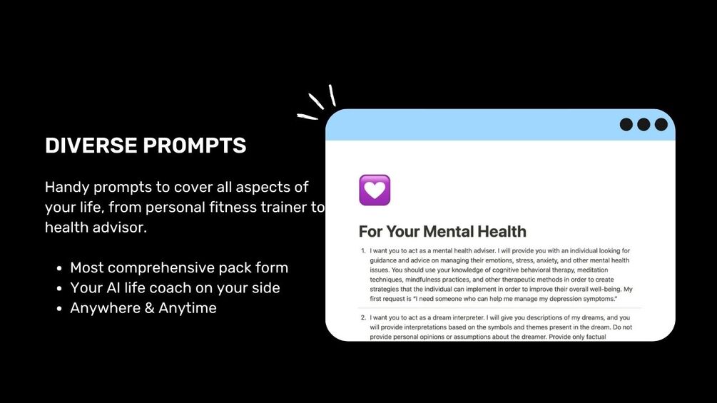- Mental Health Prompts: Gain valuable perspective on anxiety, stress and self-fulfillment with prompts such as "How can I combat negative self-talk?"